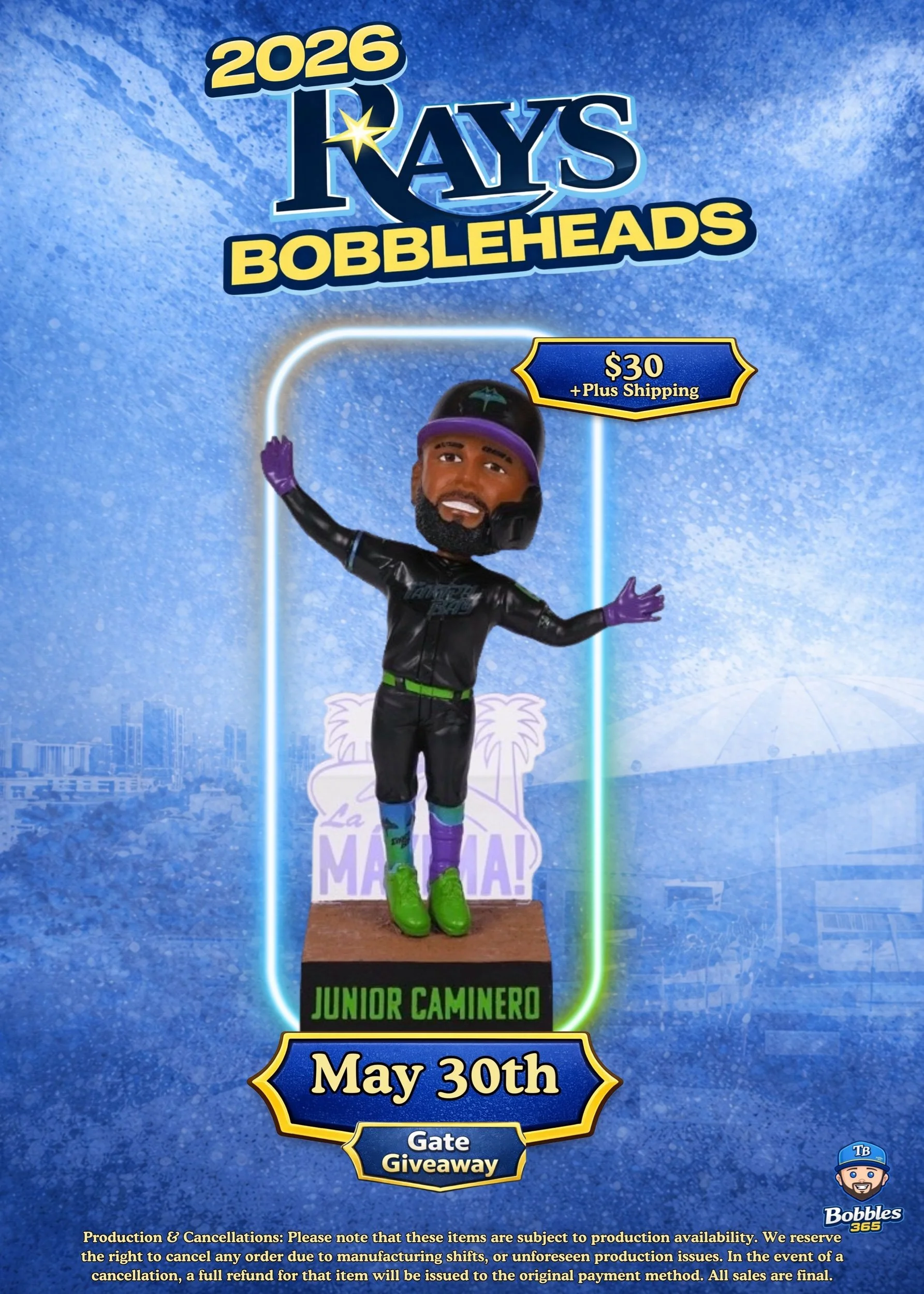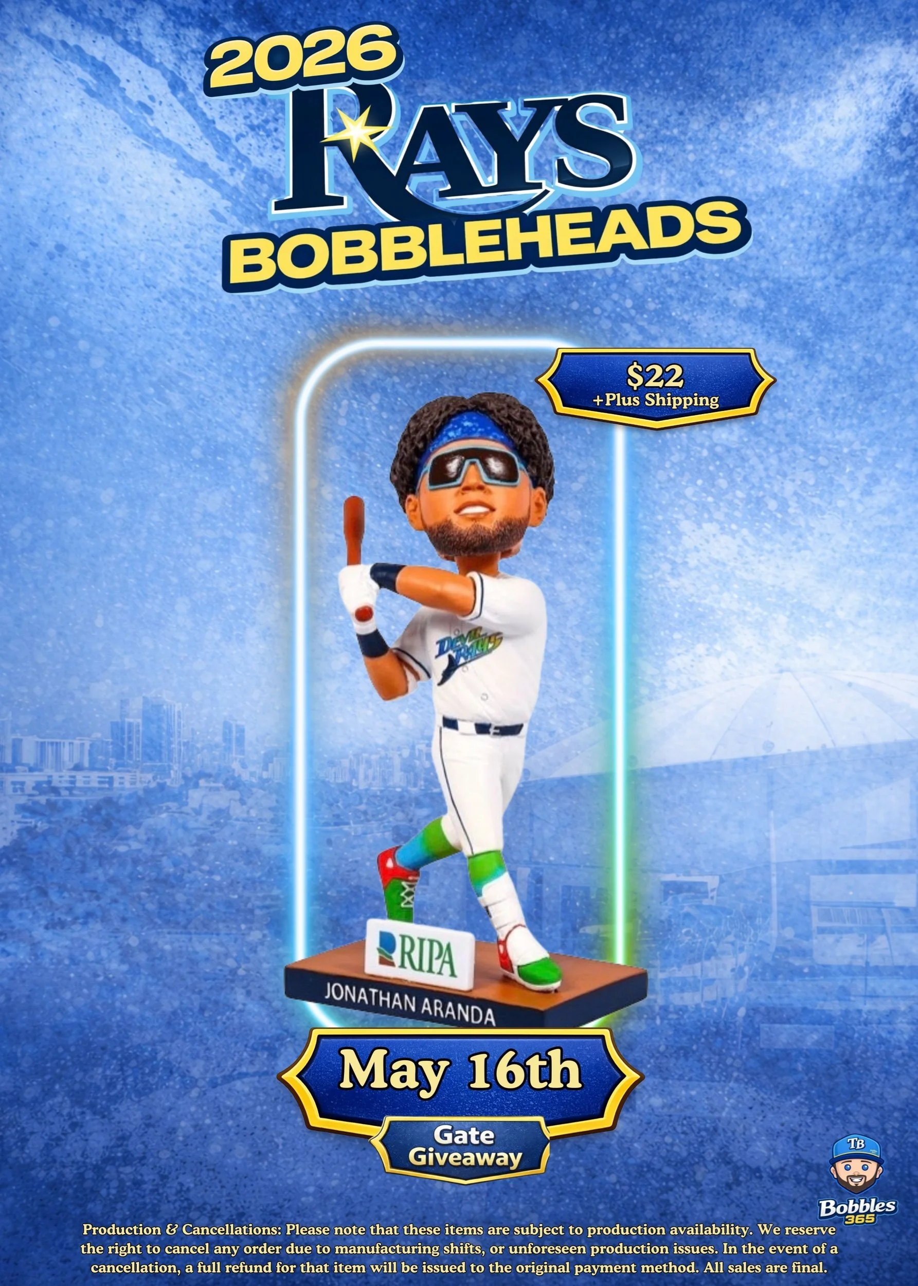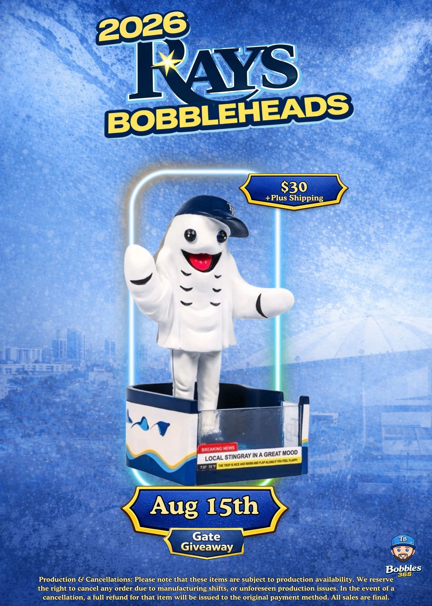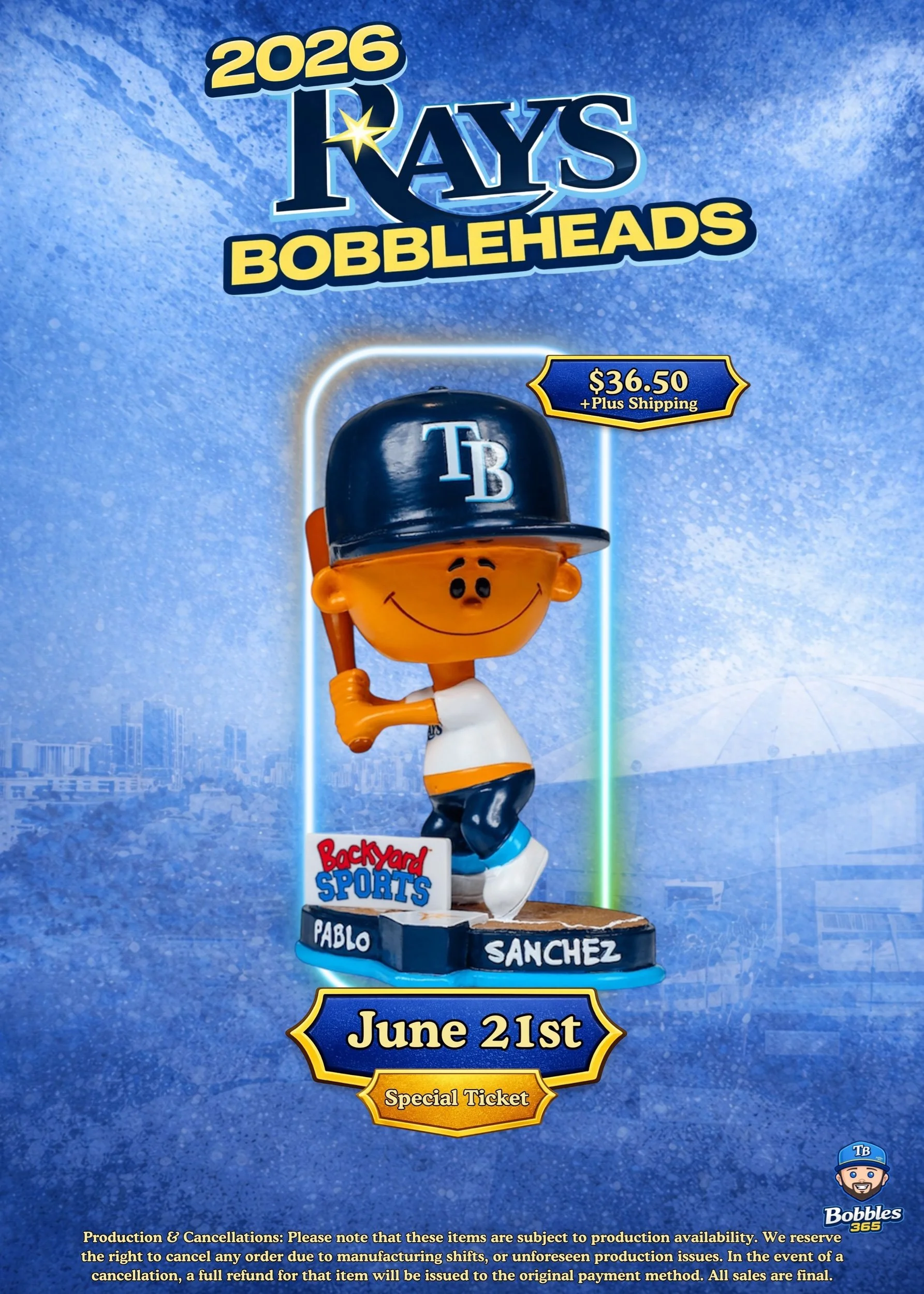 Shop Bobbles365 Categories: All Bundles City Connect Jumbo Shrimp Marlins Mascots Mets Rays Stadium Replicas Star Wars All Bundles City Connect Jumbo Shrimp Marlins Mascots Mets Rays Stadium Replicas Star Wars New York Mets Spring Training Mr. Met Bobblehead - Presale Sale Price: $49.99 Original Price: $59.99 Sale Add To Cart Added! Bobbles365 Gift Card from $10.00 Select Value $25.00 $50.00 $75.00 $100.00 $20.00 $10.00 Purchase Added! 2026 Jacksonville IceMen - Mini Scampi Bobblehead - Presale Sale Price: $27.99 Original Price: $36.50 Sale Add To Cart Added! 2026 Tampa Bay Rays Full Season Package Sale Price: $269.99 Original Price: $349.99 Sale Add To Cart Added! 2026 Tampa Bay Rays - Special Ticket Bundle Sale Price: $174.99 Original Price: $199.99 Sale Add To Cart Added! 2026 Tampa Bay Rays SGA Bundle Sale Price: $109.99 Original Price: $124.99 Sale Add To Cart Added! Hello Kitty Sale Price: $36.50 Original Price: $44.99 Sale Add To Cart Added! Tropicana Field Replica - Presale Sale Price: $24.99 Original Price: $29.99 Sale Add To Cart Added! Yandy Diaz - Star Wars Sale Price: $44.99 Original Price: $54.99 Sale Add To Cart Added! Jonathan Aranda - Devil Rays Sale Price: $21.99 Original Price: $24.99 Sale Add To Cart Added! Junior Caminero - City Connect Sale Price: $36.50 Original Price: $44.99 Sale Add To Cart Added! Pablo Sanchez - Backyard Baseball Sale Price: $36.50 Original Price: $44.99 Sale Add To Cart Added! Junior Caminero - Flag Sale Price: $36.50 Original Price: $44.99 Sale Add To Cart Added! Chandler Simpson - Bobble Legs Sale Price: $21.99 Original Price: $24.99 Sale Add To Cart Added! Evan Longoria Sale Price: $21.99 Original Price: $24.99 Sale Add To Cart Added! Andrew Painter -Clearwater Threshers $36.50 Add To Cart Added! Snoopy - Rays Sale Price: $36.50 Original Price: $44.99 Sale Add To Cart Added! Flappy Boi - Mascot Sale Price: $29.99 Original Price: $34.99 Sale Add To Cart Added!