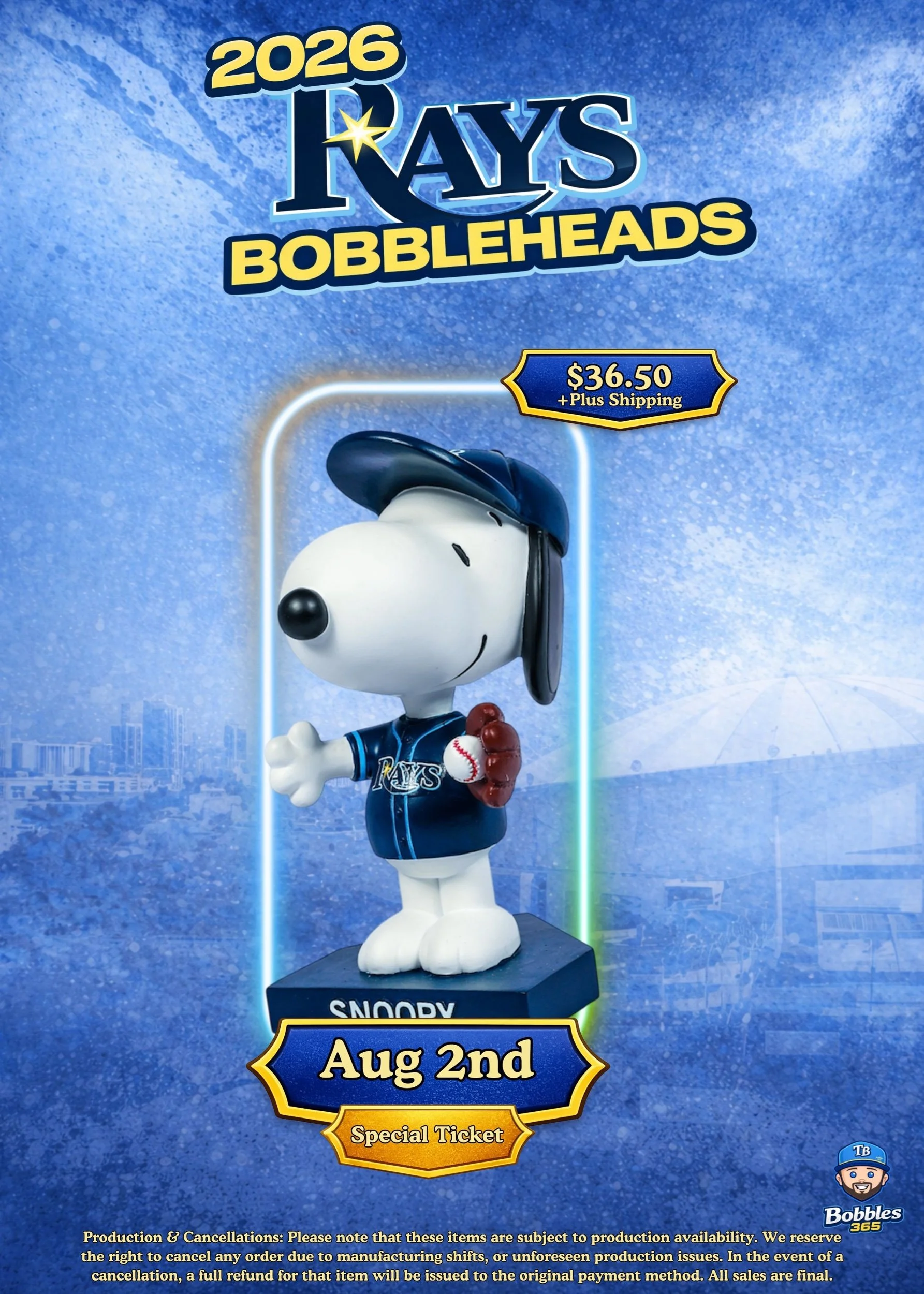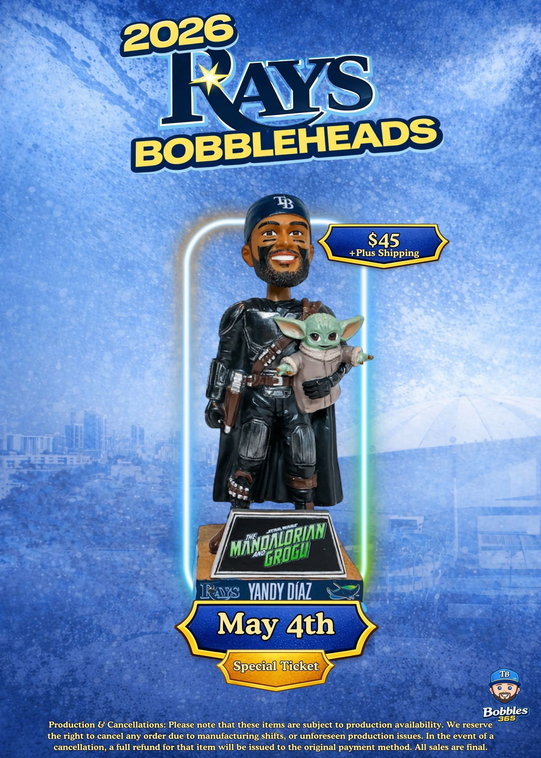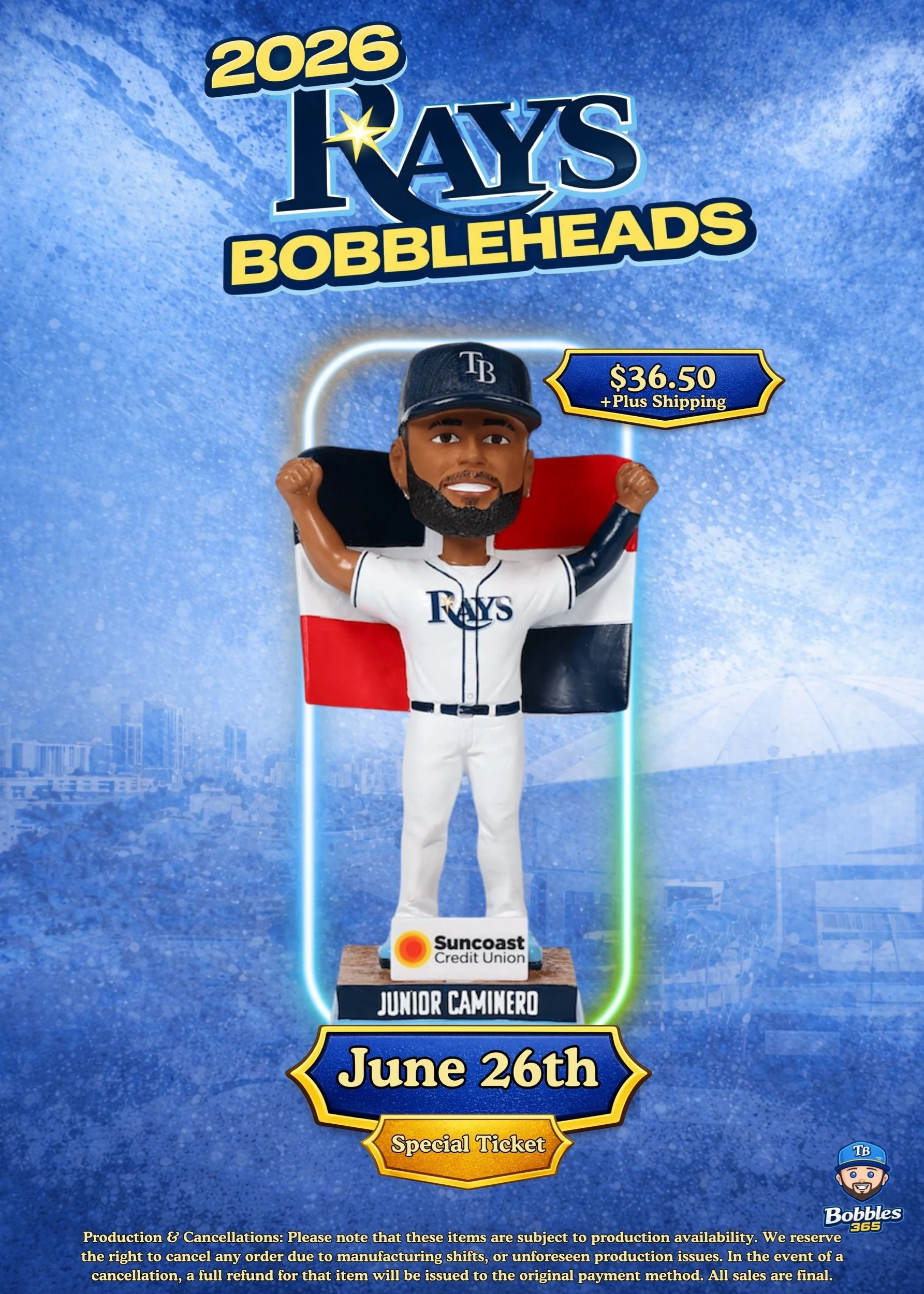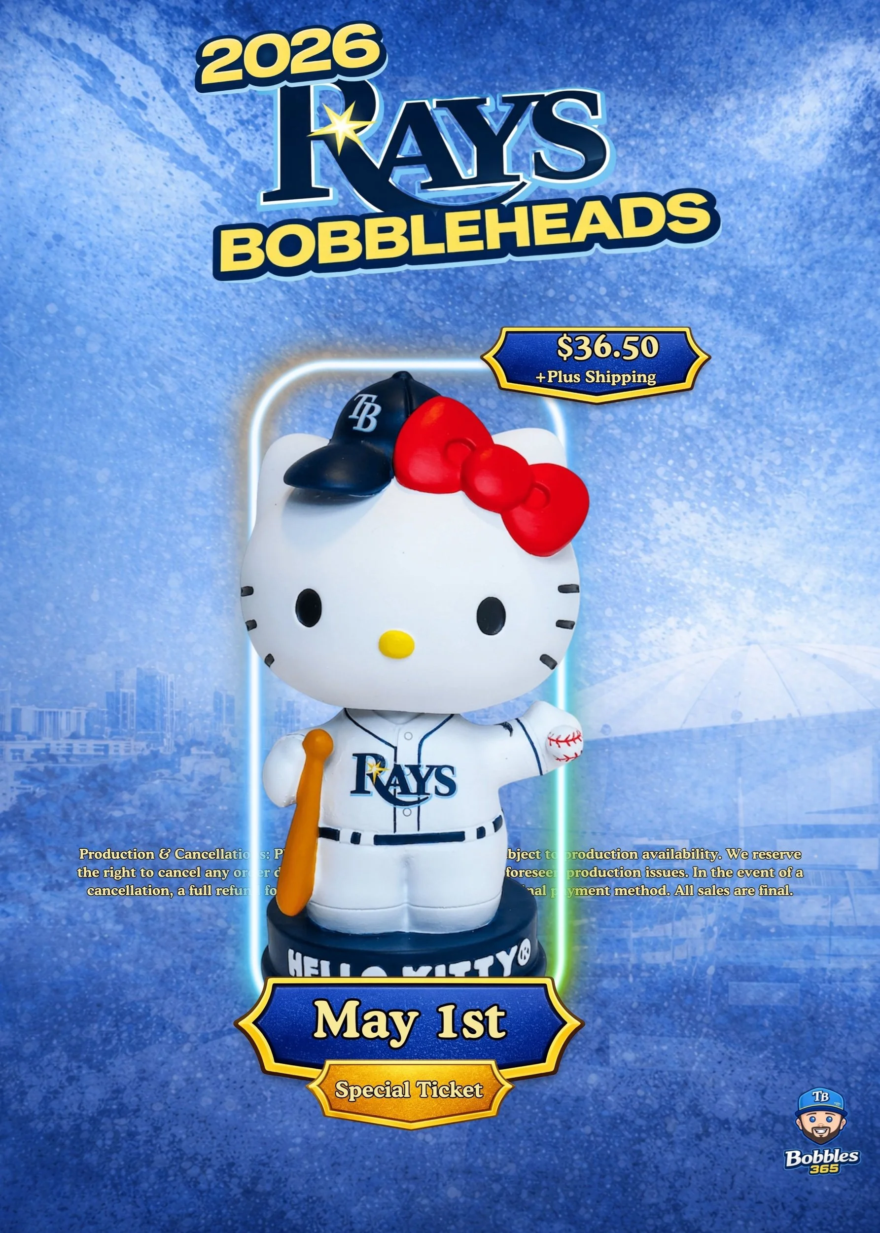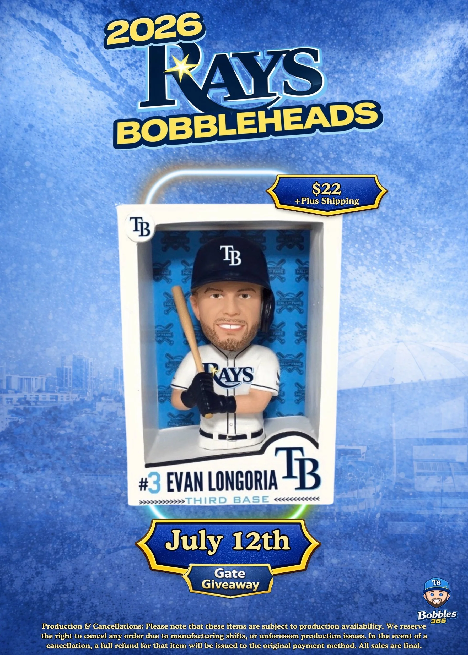 Shop Bobbles365 Categories: All Bundles City Connect Jumbo Shrimp Marlins Mascots Mets Rays Stadium Replicas Star Wars All Bundles City Connect Jumbo Shrimp Marlins Mascots Mets Rays Stadium Replicas Star Wars New York Mets Spring Training Mr. Met Bobblehead - Presale Sale Price: $49.99 Original Price: $59.99 Sale Add To Cart Added! Bobbles365 Gift Card from $10.00 Select Value $25.00 $50.00 $75.00 $100.00 $20.00 $10.00 Purchase Added! 2026 Jacksonville IceMen - Mini Scampi Bobblehead - Presale Sale Price: $27.99 Original Price: $36.50 Sale Add To Cart Added! 2026 Tampa Bay Rays Full Season Package Sale Price: $269.99 Original Price: $349.99 Sale Add To Cart Added! 2026 Tampa Bay Rays - Special Ticket Bundle Sale Price: $174.99 Original Price: $199.99 Sale Add To Cart Added! 2026 Tampa Bay Rays SGA Bundle Sale Price: $109.99 Original Price: $124.99 Sale Add To Cart Added! Hello Kitty Sale Price: $36.50 Original Price: $44.99 Sale Add To Cart Added! Tropicana Field Replica - Presale Sale Price: $24.99 Original Price: $29.99 Sale Add To Cart Added! Yandy Diaz - Star Wars Sale Price: $44.99 Original Price: $54.99 Sale Add To Cart Added! Jonathan Aranda - Devil Rays Sale Price: $21.99 Original Price: $24.99 Sale Add To Cart Added! Junior Caminero - City Connect Sale Price: $36.50 Original Price: $44.99 Sale Add To Cart Added! Pablo Sanchez - Backyard Baseball Sale Price: $36.50 Original Price: $44.99 Sale Add To Cart Added! Junior Caminero - Flag Sale Price: $36.50 Original Price: $44.99 Sale Add To Cart Added! Chandler Simpson - Bobble Legs Sale Price: $21.99 Original Price: $24.99 Sale Add To Cart Added! Evan Longoria Sale Price: $21.99 Original Price: $24.99 Sale Add To Cart Added! Andrew Painter -Clearwater Threshers $36.50 Add To Cart Added! Snoopy - Rays Sale Price: $36.50 Original Price: $44.99 Sale Add To Cart Added! Flappy Boi - Mascot Sale Price: $29.99 Original Price: $34.99 Sale Add To Cart Added!